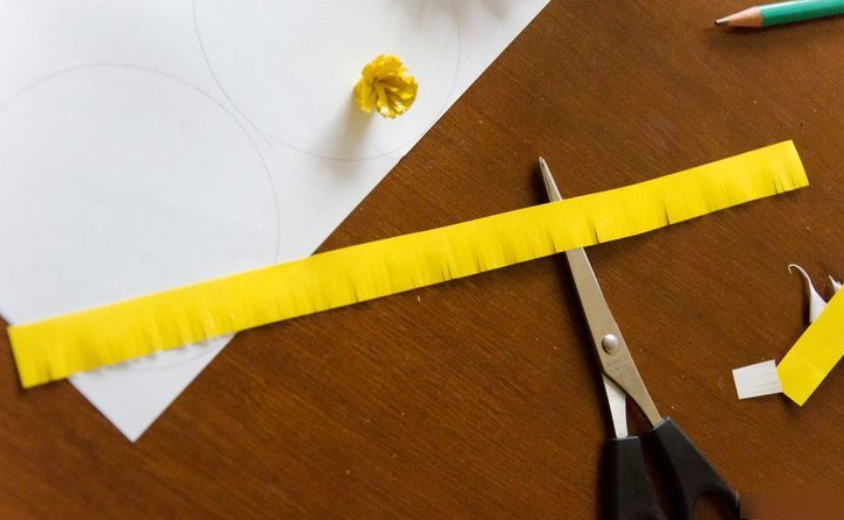 Для серединки ромашки вырезать длинную полоску из гофрированной бумаги желтого цвета. Одну сторону ножничками разрезать соломкой и плотно свернуть полученную заготовку в кружок.