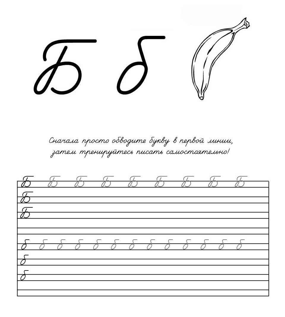 Для начала мы рекомендуем соединять пунктирные линии отдельных элементов буквы, чтобы приобрести навыки мелкой моторики, которые в дальнейшем помогут в написании самой буквы «Б, б». После этого предложите ребёнку написать несколько раз уже целую букву «Б» с помощью пунктирных линий. Последний этап изучения написания — это написание буквы самостоятельно, без вспомогательных пунктиров. Попросите ребёнка написать букву в тетради. Будет правильно, если перед его глазами будет находится образец написания буквы «Б, б». Благодаря этому, первое время ребенок сможет подглядывать как правильно писать буквы. Позже убирайте шпаргалку, чтобы он писал буквы по памяти.