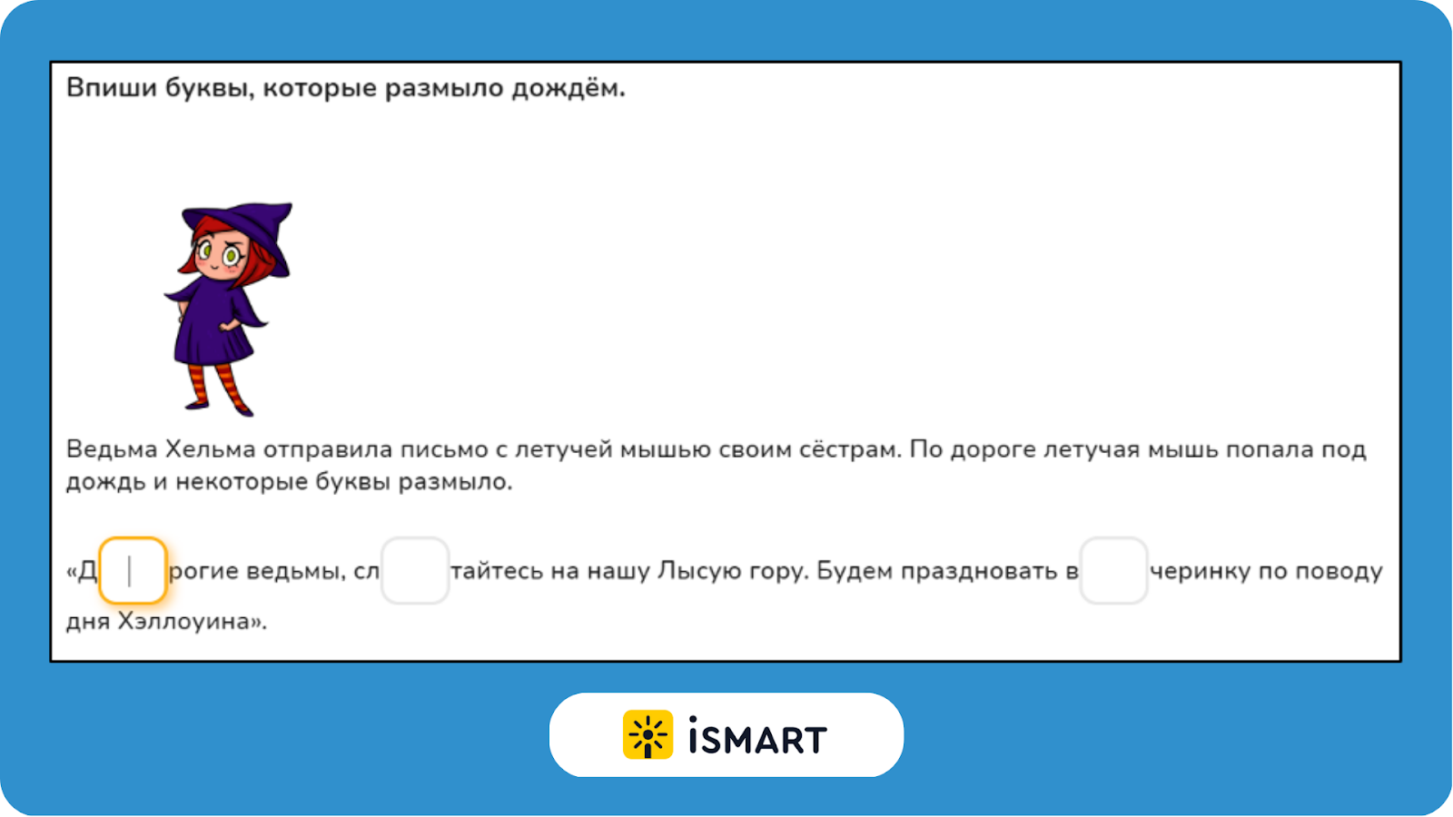 А ещё материал по этой теме можно легко закрепить, занимаясь на образовательной онлайн-платформе iSmart. На ней представлено более 300 000 заданий на закрепление любых тем, изучаемых в рамках школьной программы. Интерактивные задания увлекательны, предложены в игровой форме. Так запоминать правила и тренировать умения намного интереснее! Задания по русскому языку выглядят вот так: