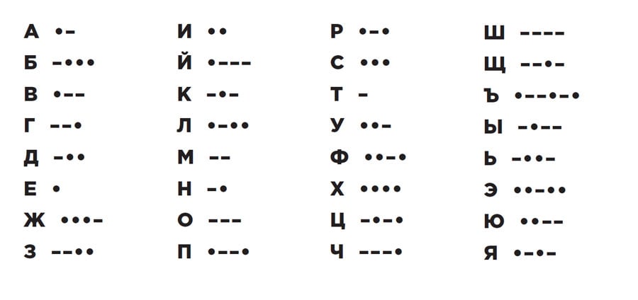 В азбуке Морзе каждая буква алфавита, цифры и наиболее важные знаки препинания имеют свой код, состоящий из череды коротких и длинных сигналов:Чаще всего это шифрование передаётся световыми или звуковыми сигналами.