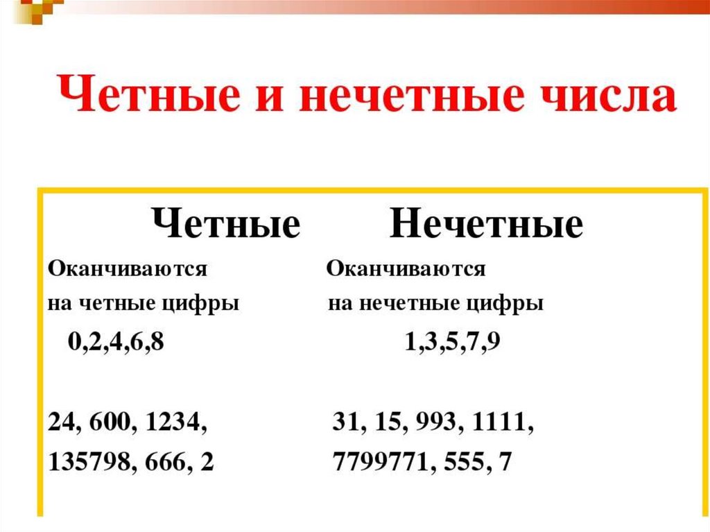 Запомнив числа первого десятка, ребята без труда смогут определить четность или нечетность всех остальных чисел, посмотрев на последнюю цифру. Например,: 45, оно оканчивается на 5, нечетное число, значит и 45 — нечетное.