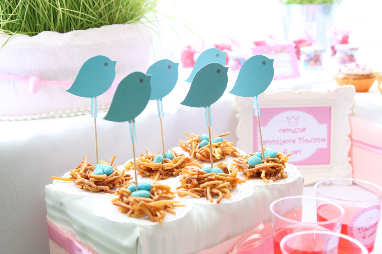 Украшение стола на крестины зависит только от вас. Вы можете использовать небольшие флажки и гирлянды, указатели для продуктов, а также украсить поверхность столов небольшими композициями на детскую тему.