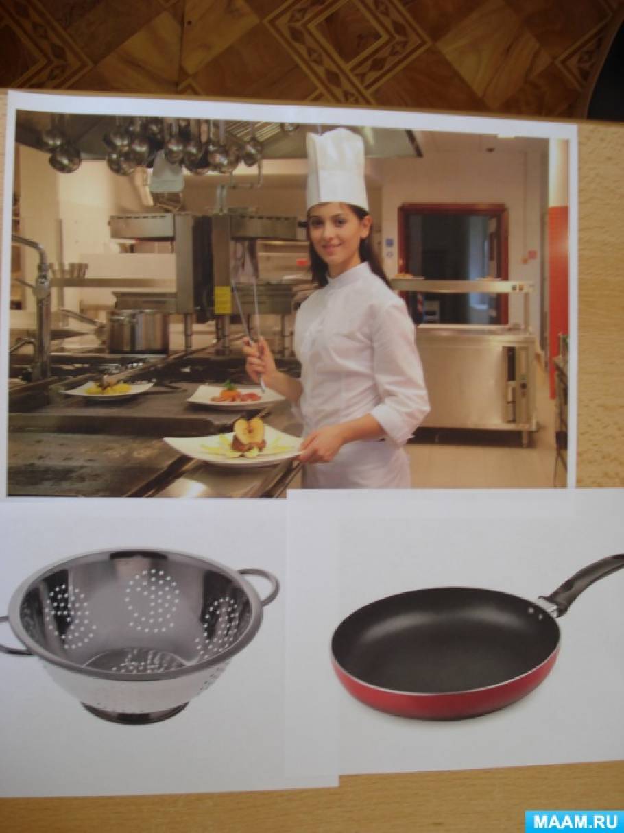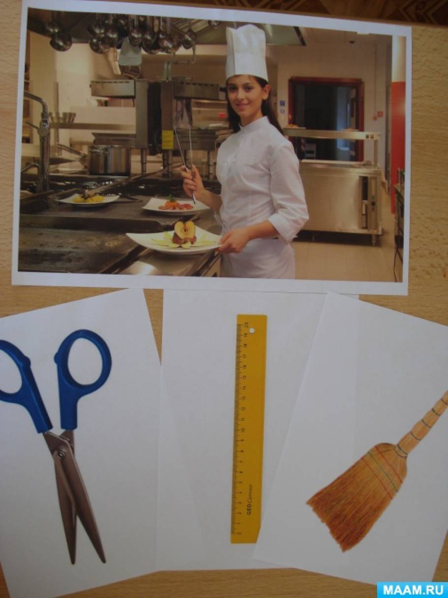 Цель: учить детей описывать нужный предмет, упражнять в умении называть предметы необходимые людям определённой профессии.
