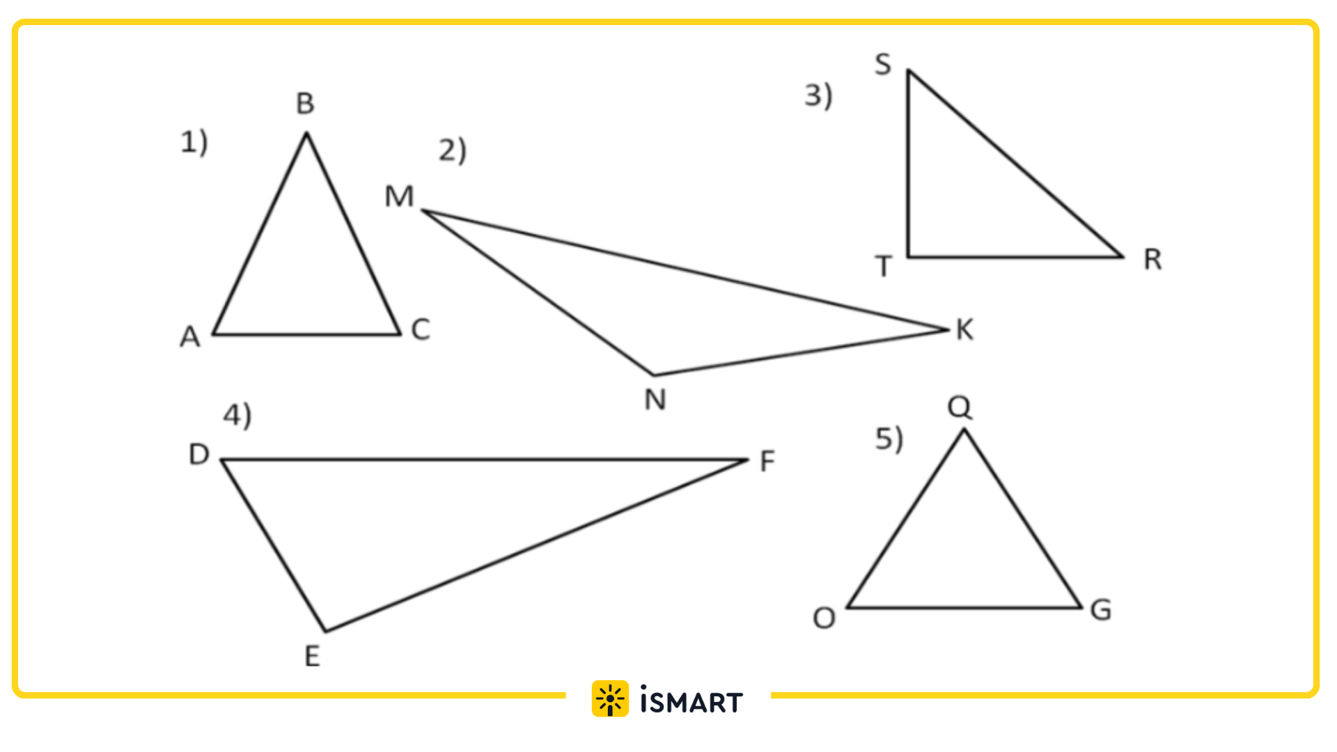 Вершины треугольников обозначаются заглавными буквами латинского алфавита: A, B, C и др.