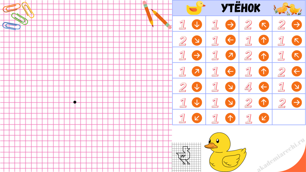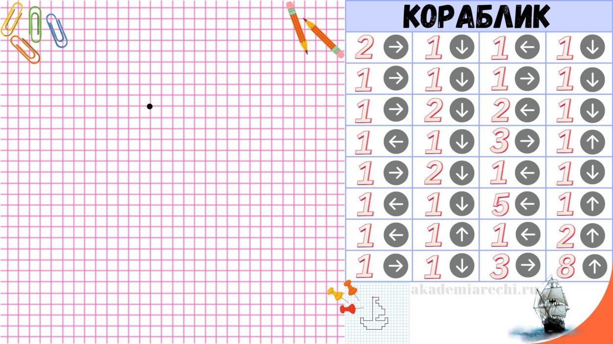 Полезно учить графическому диктанту трёх видов. Обязательно слова сопровождайте показом. Сядьте рядом, чтобы рисунок не был перевёрнутым для ребёнка.