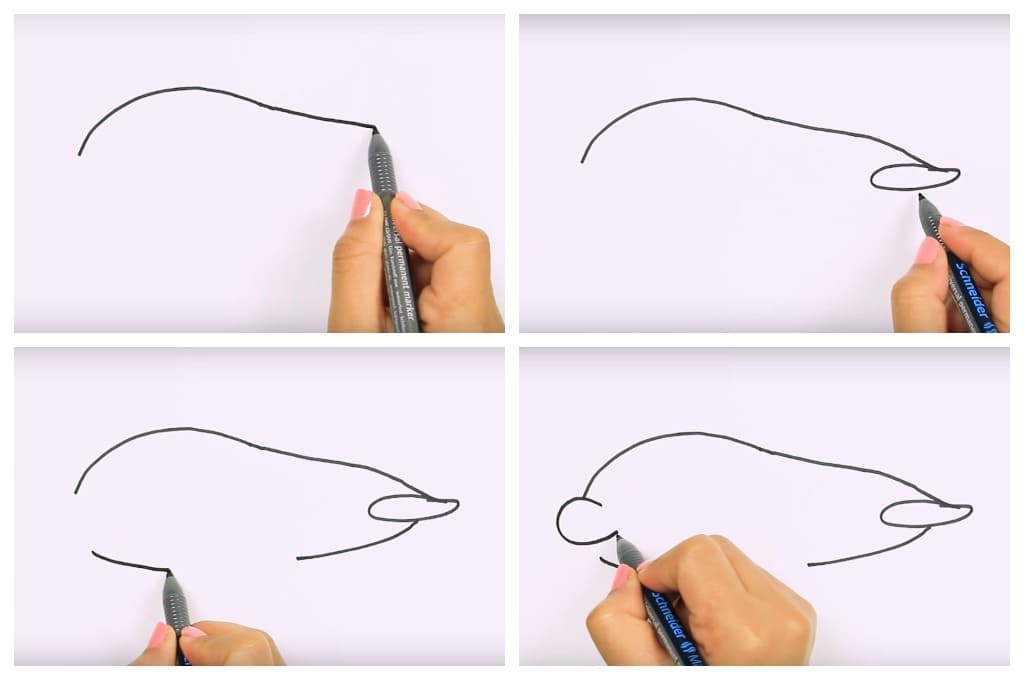 Разверните белый лист бумаги горизонтально. Нарисуйте основание в виде овала, проведите внутри него линию. В правом основании проведите две прямые, как начало хвоста, а в левом — маленький овал или набросок правого двигателя.