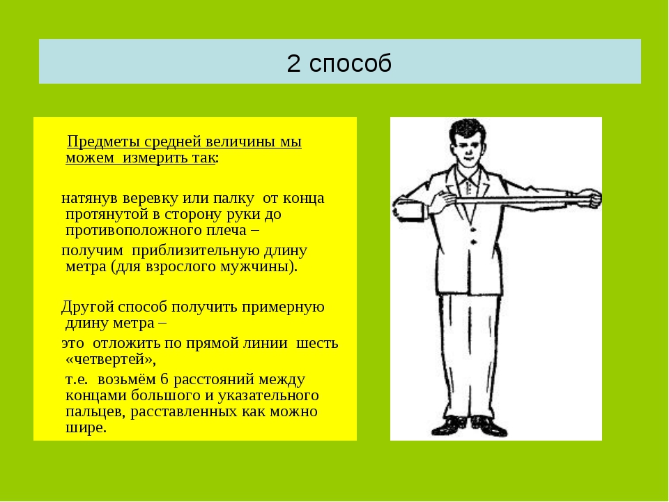 Один из таких предметов можно взять за эталон ( зная его длину ) и посчитать, сколько раз данный предмет умещается в том предмете ( количество ), который нужно померить. Затем длину предмета-эталона умножить на посчитанное количество, так мы получим примерный размер предмета, который нас интересует.