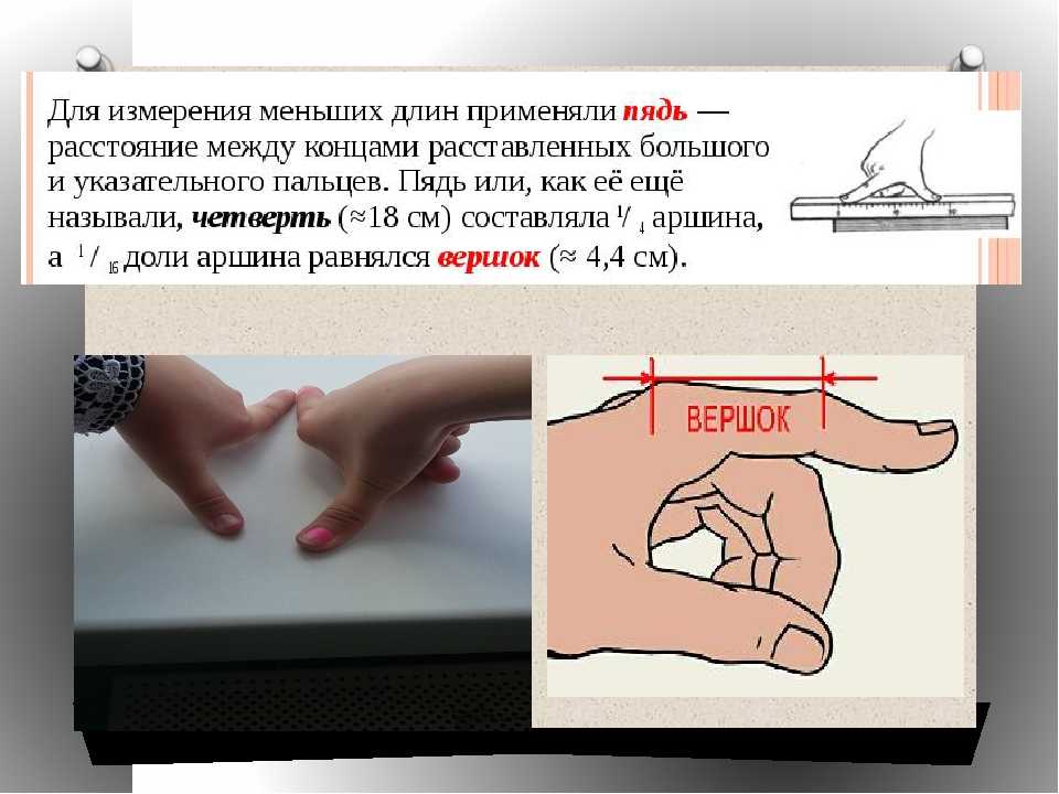 На этом факте основана английская система мер длины, основными единицами которой являются футы и дюймы. Дюйм по-голландски означает «большой палец». Посмотрите на свои пальцы: каждый палец разделён на три примерно равных по размеру фаланги. Так вот, длина каждой фаланги и есть «дюйм». В разных странах величины дюймов различаются от 23 (Мексика) до 37 мм (Пруссия), но наиболее распространён английский дюйм — 25,4 мм.