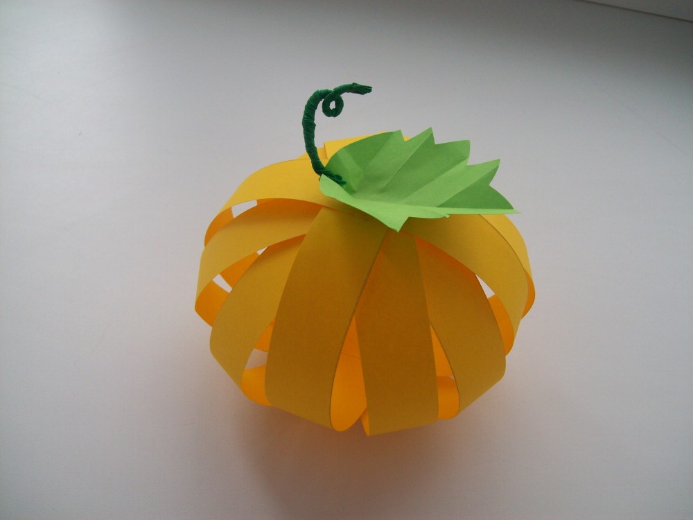 Под каждый плод вырезать круг – основание, по размеру, чуть меньше, чем основание плода. К этому кругу степлером прикрепить полоски бумаги шириной 1 см, длину скорректировать таким образом, чтобы противоположные полоски соединялись на 2-3 см выше фрукта. Полосок должно быть много, тогда фонарик будет смотреться красиво.