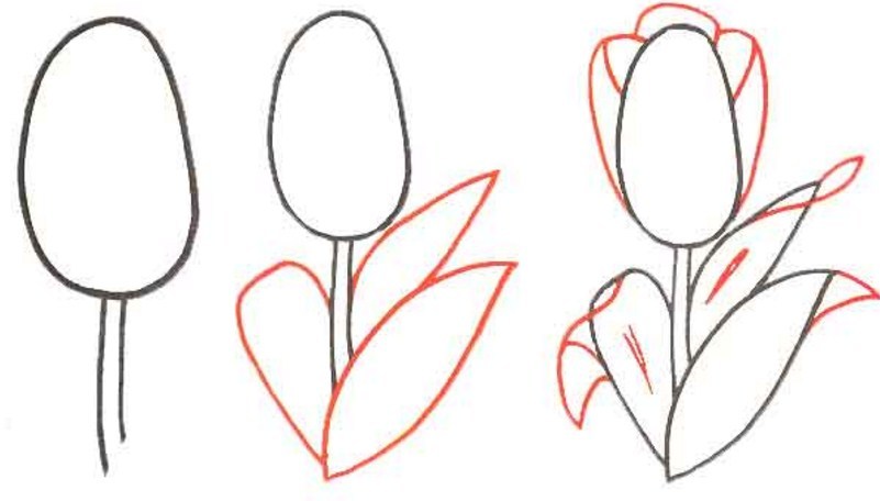 Как правило, рисование цветка начинают с бутона, а затем рисуют стебель и листочки.