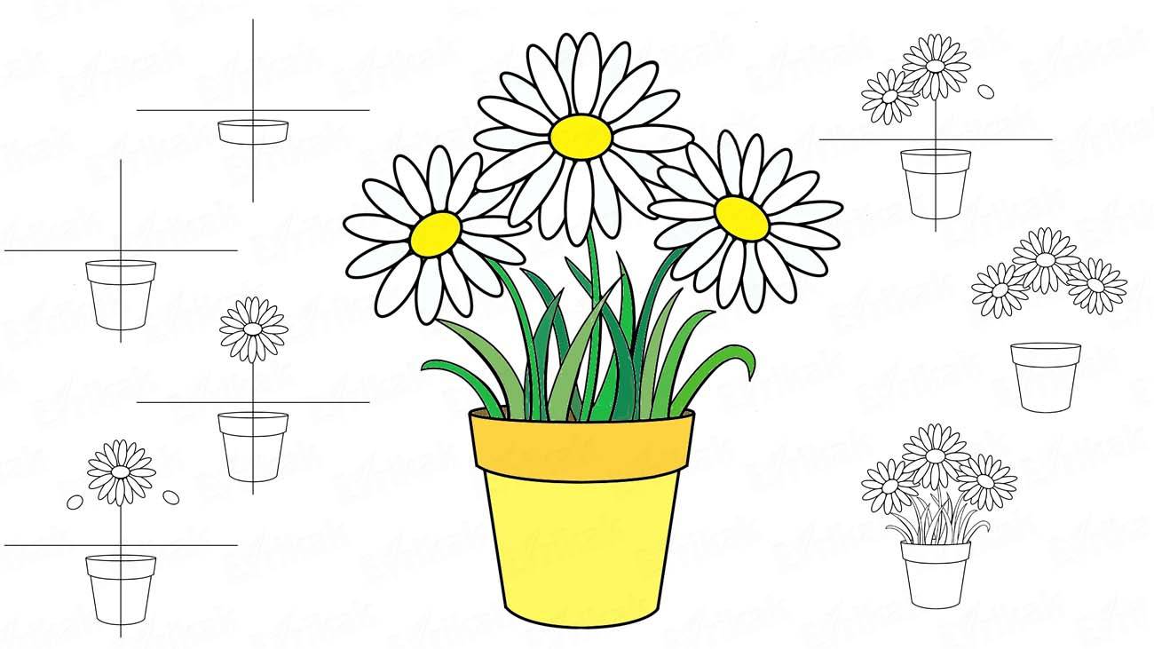 Отметим, что во всех случаях контур самого цветка и горшка лучше всего сначала обозначить простым карандашом. Это позволит сделать образ более реалистичным и гармонично расположить его на листе бумаги (откорректировать размер).