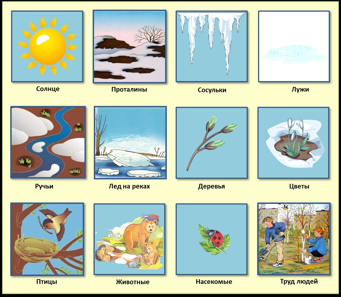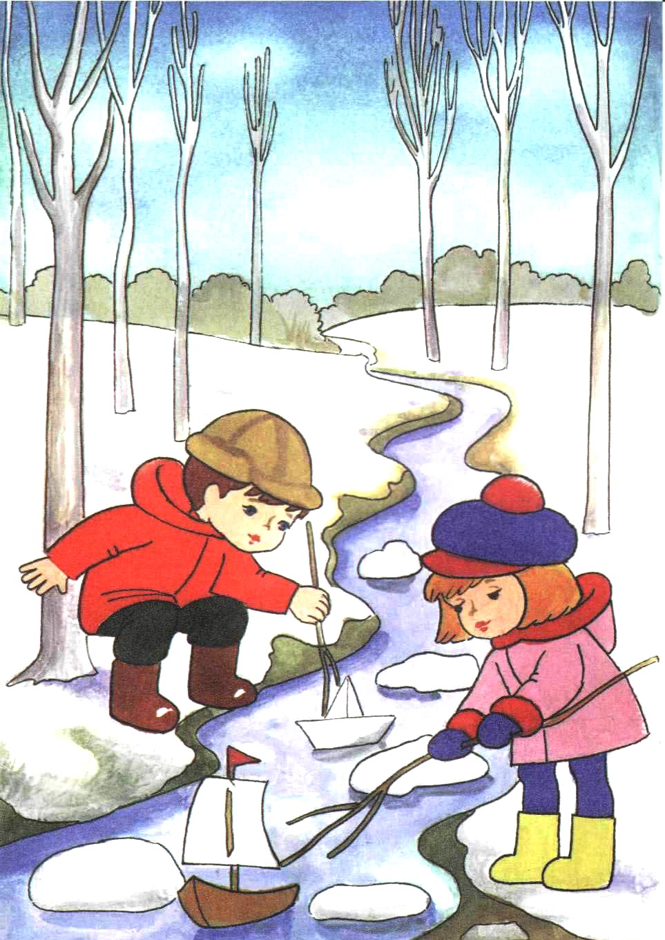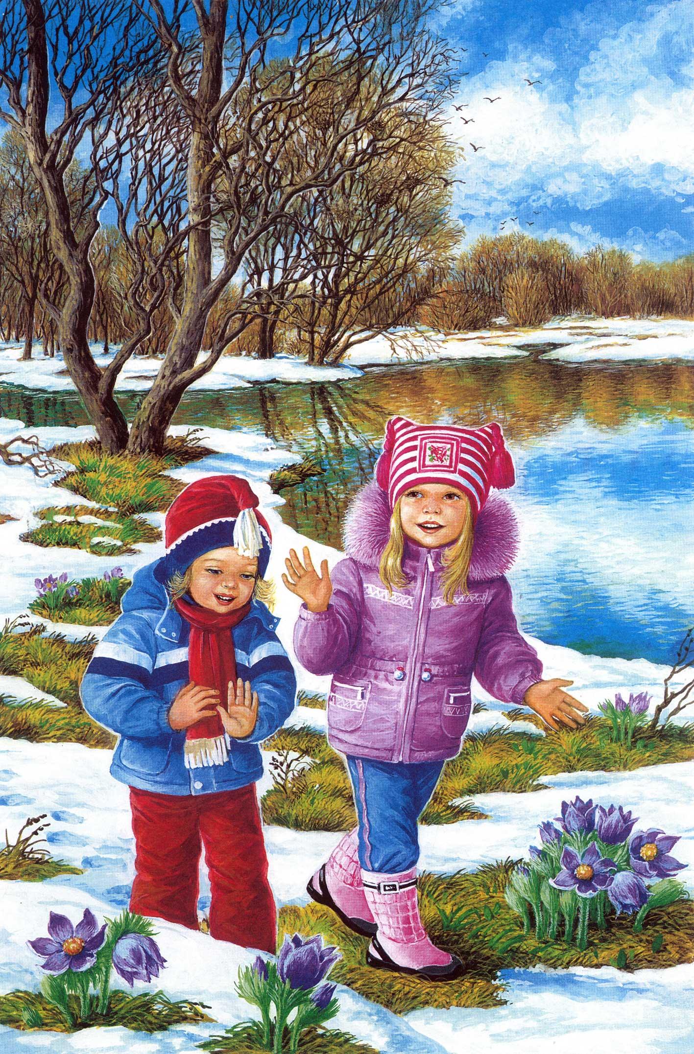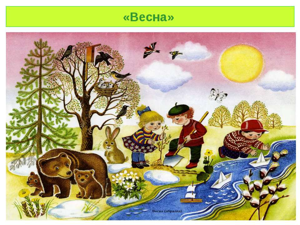 Ещё одна красавица — весна, за которой тянутся ребята. На картинке также изображены все признаки весны