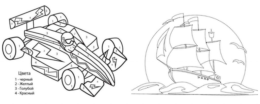 Гоночный автомобиль станет как настоящий, если раскрасить его по цветам, которые указаны под номерками. Корабль отправиться бороздить моря. Нужно только соединить по точкам рисунок.