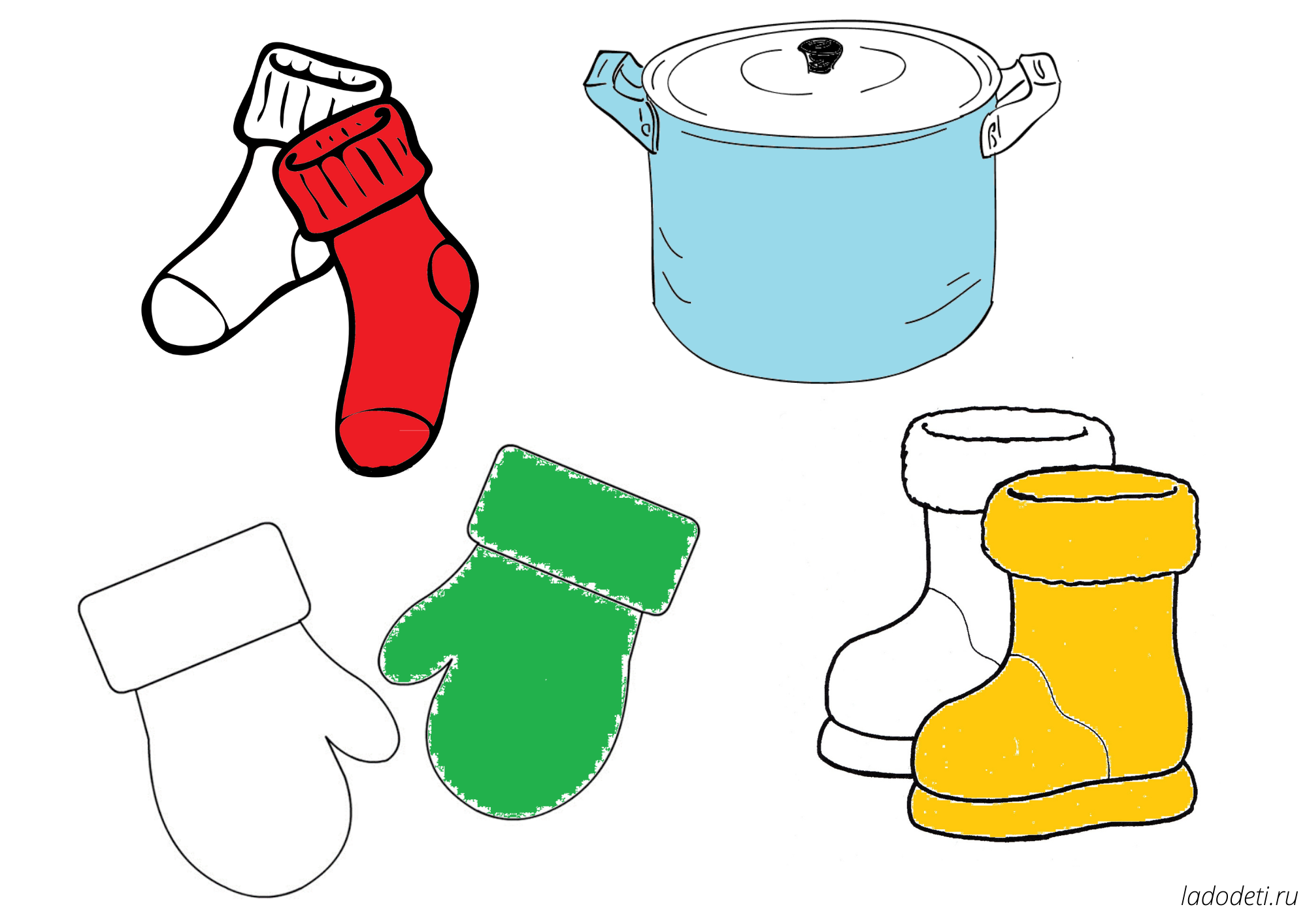 Нарисовать парные предметы, один из которых раскрасить, а другой оставить нераскрашенным. Например, кастрюли и крышки, фрукты и тарелки, конфетки и фантик. Ребенок должен подобрать цвет нераскрашенного предмета под цвет его пары. Если кастрюля голубая, то и крышку нужно сделать голубой. Для этого можно ее раскрасить карандашами или красками, размазать на ней пластилин нужного цвета.
