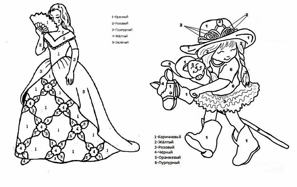 Прекрасная принцесса и девочка с игрушечной лошадкой. Их нужно раскрасить по цветам, которые обозначены под каждой цифрой.