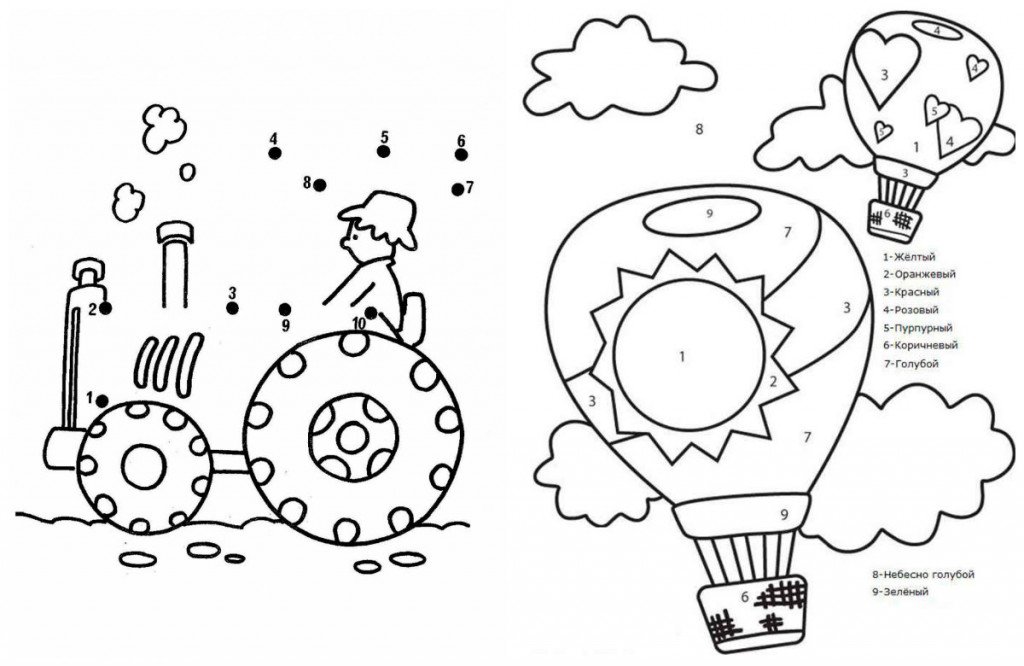 Сразу два вида раскраски на одной картинке. В первом случае нужно соединить линии, в другом раскрасить по цифрам.