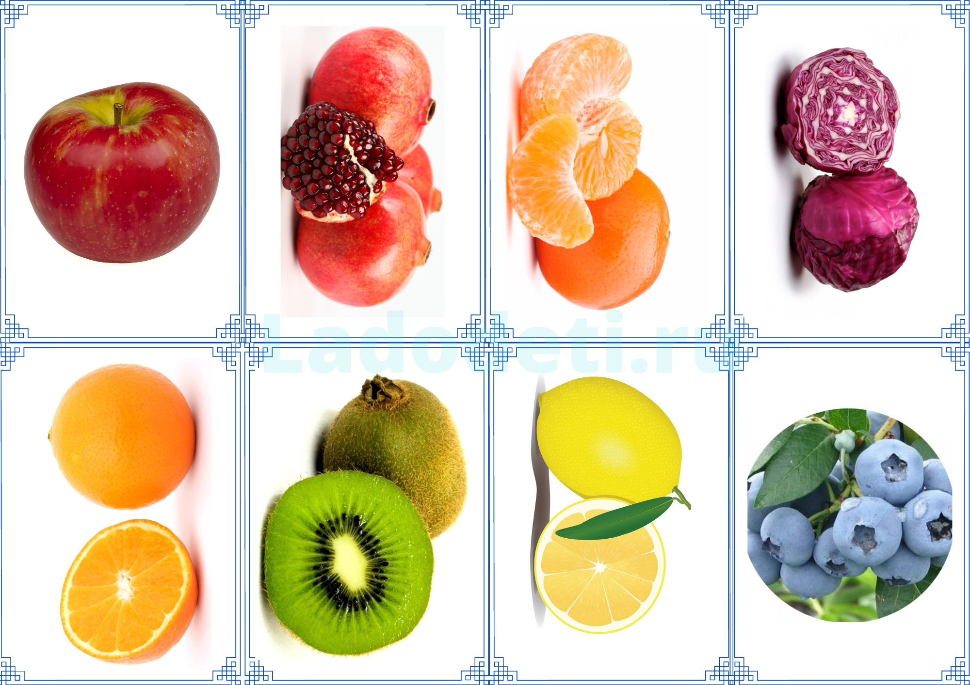- Можно распечатать карточки с цветными фруктами и попросить ребенка, чтобы он разложил их по цвету (для этого также можно использовать карточки Домана, приведенные выше. Например, к красной карточке ребенок подбирает красные фрукты и т. д.).