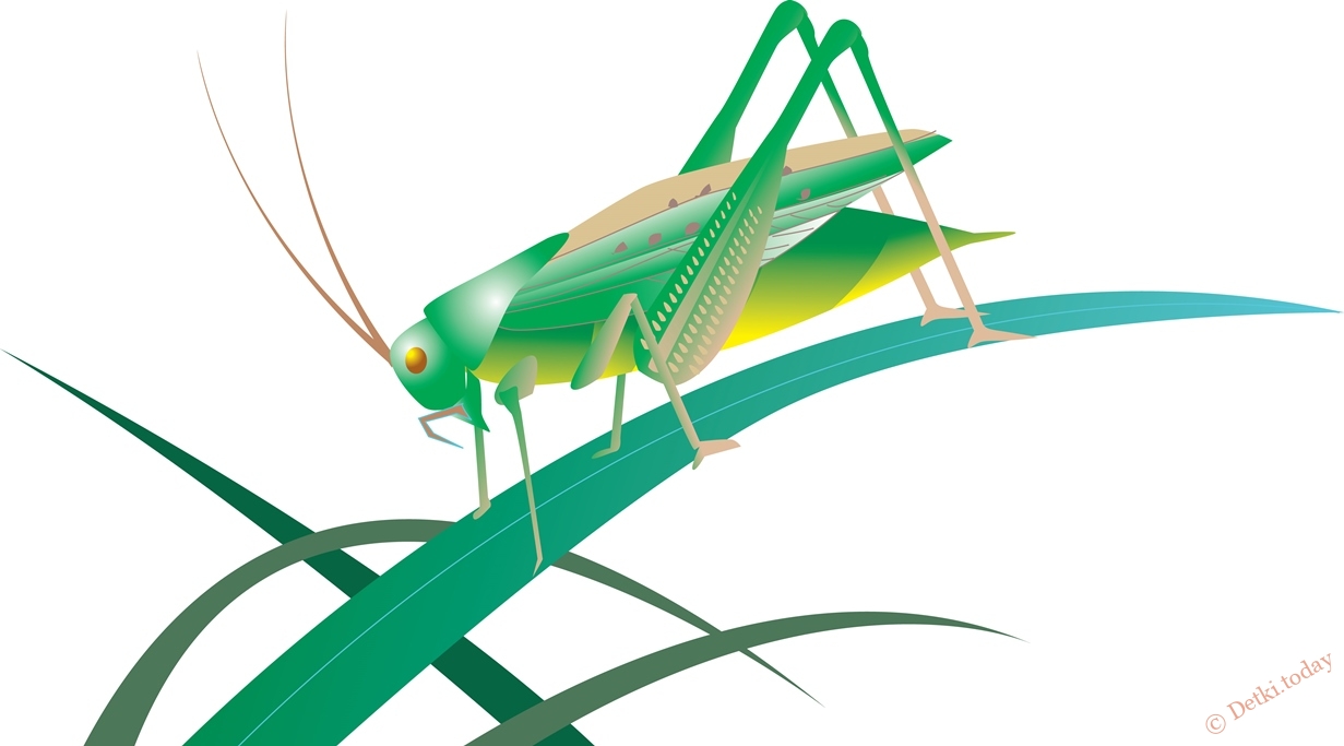 Забавные картинки кузнечика понравятся малышам. На них букашка изображена с добрыми глазами, лукавой улыбкой. На одном из рисунков она сидит на травинке, как и бывает в природе.
