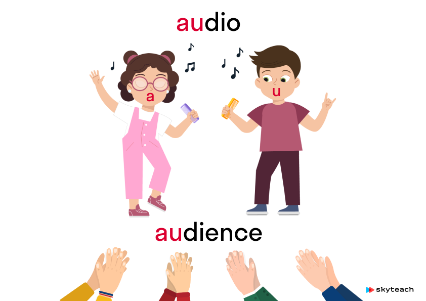 H h — трудолюбивая и отзывчивая буква. Она помогает грустной fish, застенчивому chick и веселому thumb.W w — высокомерная буква, похожая на корону, поэтому она любит всем приказывать. Трудолюбивую H h она заставляет молчать, а буква A a из-за нее звучит (what, want). A a и U u — буквы, которые при встрече очень любят петь, особенно осенью (in autumn), и звучат так красиво (beautiful audio), что публика (audience) всегда провожает их бурными аплодисментами!