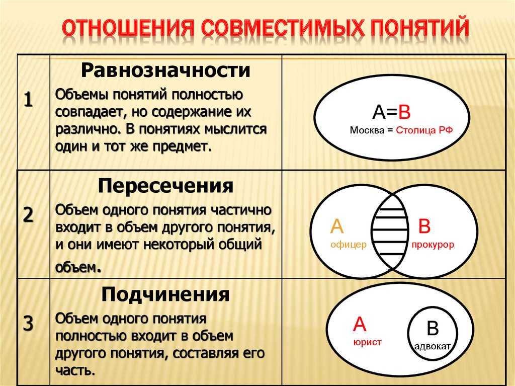 Сравнимые понятия подразделяются на совместимые и несовместимые. Совместимые понятия отличаются тем, что имеют хотя бы один общий элемент:
