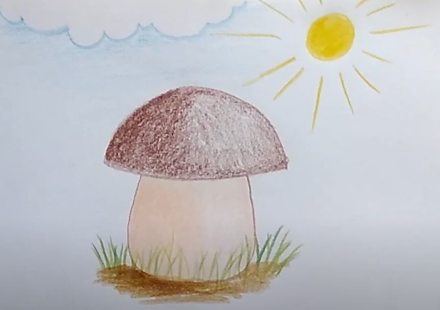 - Теперь можно приступить к раскрашиванию. Верхушка будут коричневые. Показать небольшой светлый блик. Основание делаем серого цвета, а траву зеленую. Нижнюю часть шляпки закрашиваем бледно-желтой краской. Рисунок готов.
