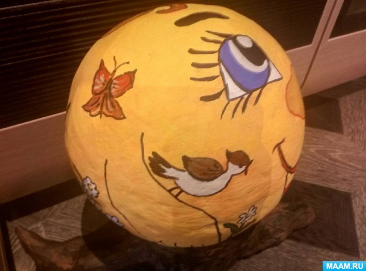 Интересен и неординарен вариант изготовления Колобка из папье-маше (рис. 6). Здесь используется методика оклеивания круглого предмета смесью увлажненных измельченных лотков для яиц с клеем ПВА. Нанесение такого слоя придаст скульптуре объемности, неоднородности, визуальной натуральности. После высыхания формы, на нее наносится водоэмульсионная краска, лучше белого цвета. По мере её высыхания приступают к окрашиванию макета Колобка желтой краской (окончательный вариант).