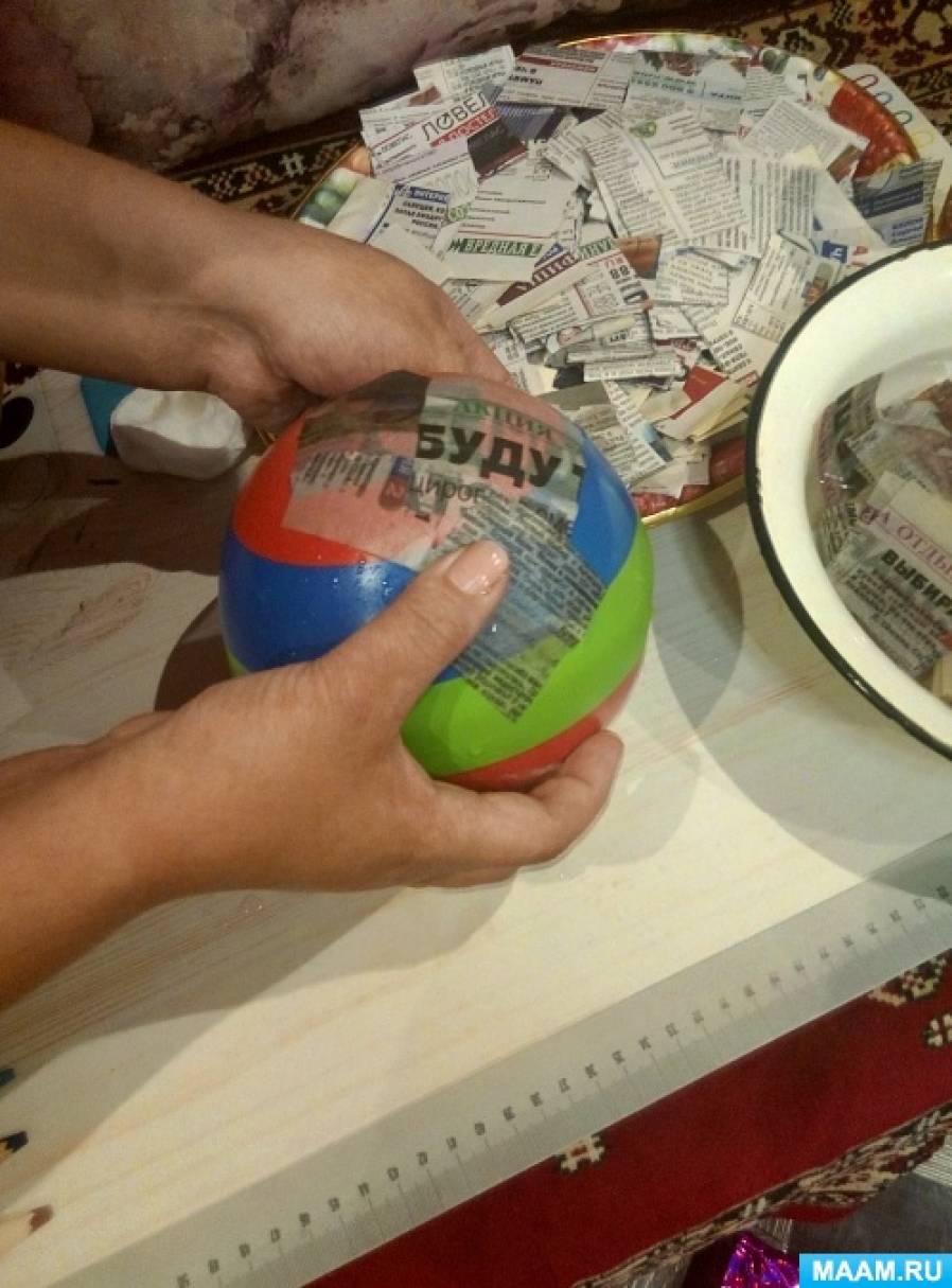 Смачиваем кусочки газеты с одной стороны водой, начинаем накладывать на мяч.