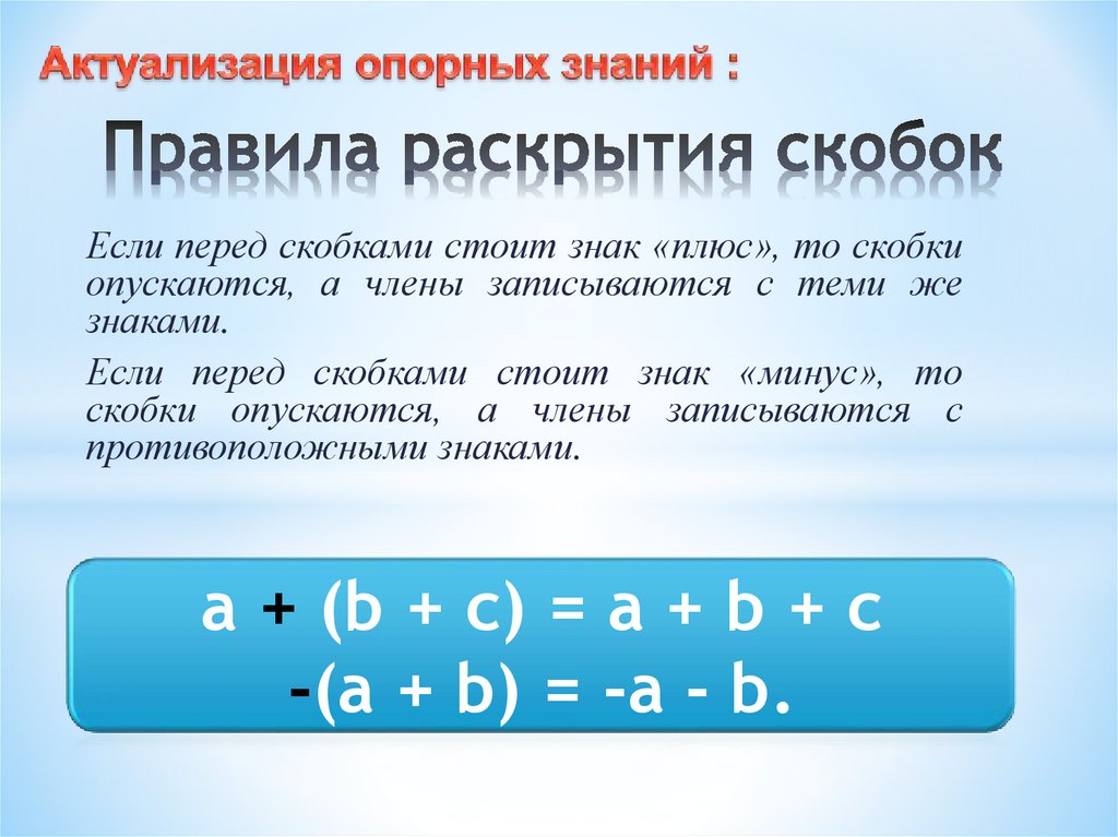 Зная правило вычитания отрицательных чисел, можем сделать вывод, что знаки, стоящие перед скобками, могут менять знак числа, находящегося в скобках.