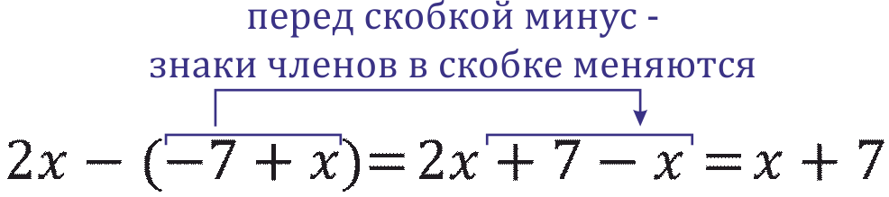 Пример: Упростите выражение \(2x-(-7+x)\).Решение: внутри скобки два слагаемых: \(-7\) и \(x\), а перед скобкой минус. Значит, знаки поменяются – и семерка теперь будет с плюсом, а икс – с минусом. Раскрываем скобку и приводим подобные слагаемые.