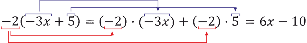 Пример. Раскройте скобки \(-2(-3x+5)\).Решение: Как и в предыдущем примере, стоящие в скобке \(-3x\) и \(5\) умножаются на \(-2\).