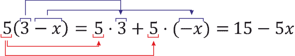 Пример. Раскройте скобки \(5(3-x)\).Решение: В скобке у нас стоят \(3\) и \(-x\), а перед скобкой — пятерка. Значит, каждый член скобки умножается на \(5\) — напоминаю, что знак умножения между числом и скобкой в математике не пишут для сокращения размеров записей.