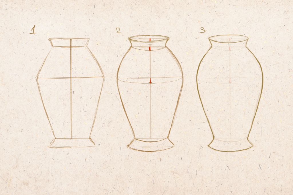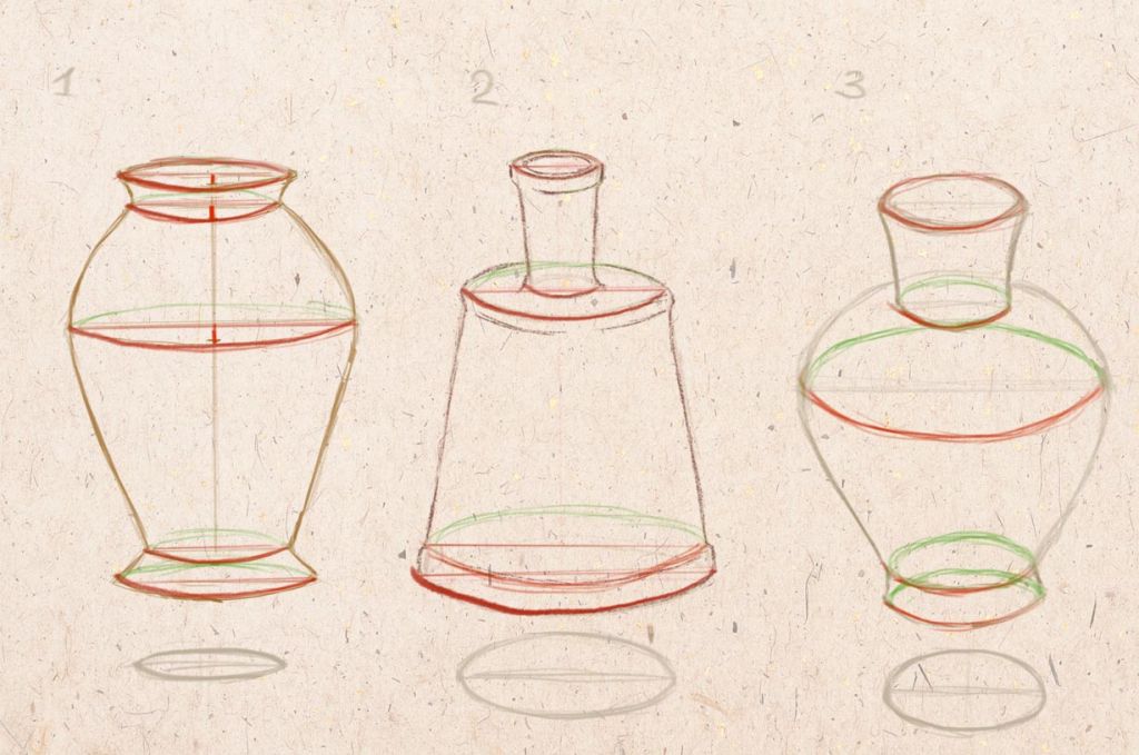 Нужно четко представлять или легко намечать овалы, из которых состоит сосуд: овал дна посудины, овал самого широкого выступа, овал горлышка и т.п.