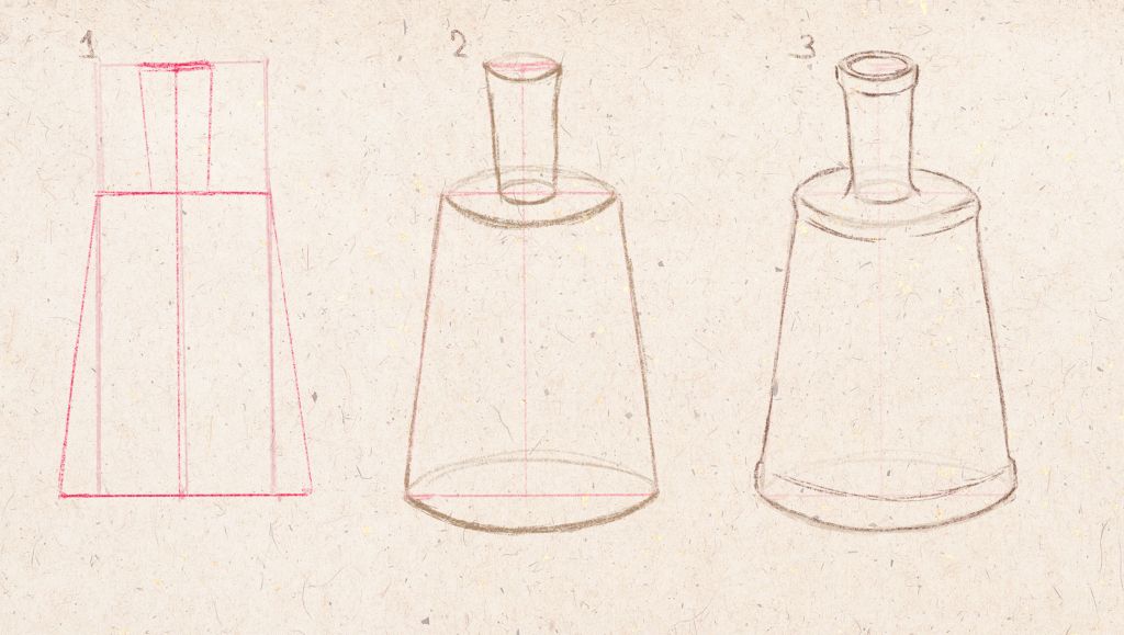 На фотографии выше намечены фигуры, в которые можно вписать сосуды разной формы. После, прямые линии мы сделаем более плавными а углы скругленными.