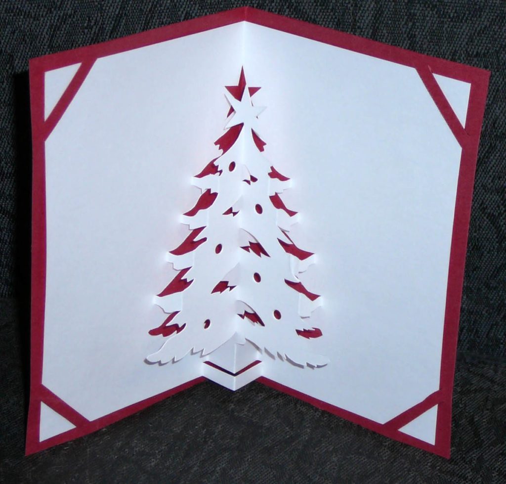 Сверните альбомный лист пополам, нарисуйте на сгибе елочку с украшениями. Прорисуйте в этом случае ветки, чтобы их хорошо было видно. С помощью канцелярского ножа вырежьте каждую линию, чтобы елочку можно было отогнуть, и она выглядела объемно, когда вы станете приклеивать ее к основе. Основа на примере в красном цвете, но вы можете выбрать зеленый или любой другой, который вам нравится.