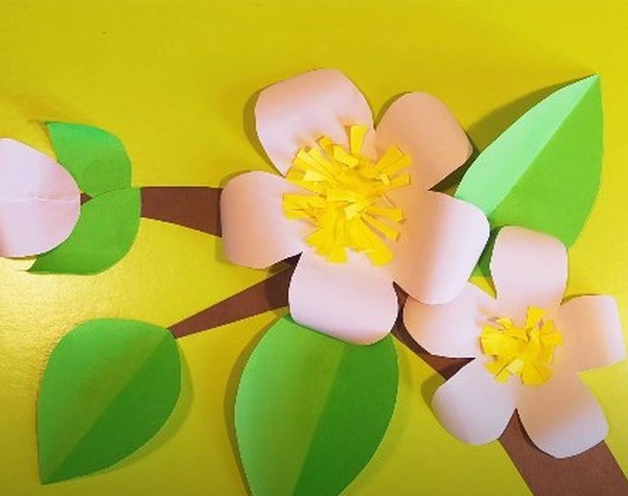 Вам понадобится трафарет ветки и цветка, бумага разноцветная, ножницы и клей, картон для основы. Вырежьте все трафареты, оформите их на картоне и поделка готова.