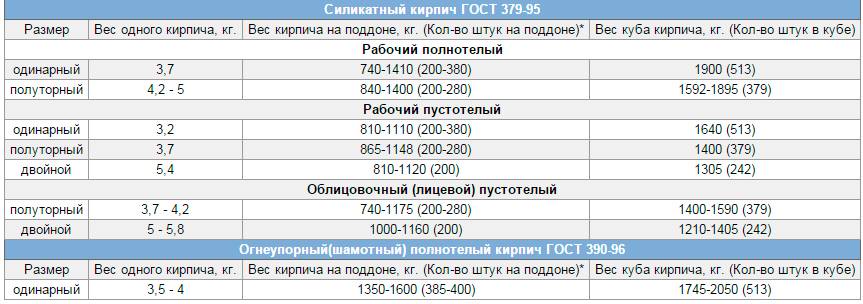 По ГОСТу поддон с красным кирпичом должен иметь вес не более 850 килограмм, но не все придерживаются этого показателя. Некоторые производители могут использовать тару, которая позволяет транспортировать до 3 тонн материала. Кирпич может укладываться рядами или под углом, от этого зависит вес поддона с материалом. Чтобы рассчитать вес поддона с кирпичами, необходимо к массе лафета прибавить общую массу всех элементов. Для этого нужно узнать массу одного кирпича, и умножить этот показатель на количество материала, уложенного в поддон.