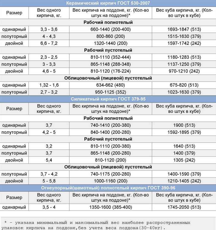 Эти расчёты можно принимать во внимание только в качестве приблизительного показателя, так как кирпичи у разных производителей могут сильно варьировать по плотности и даже немного по геометрическим параметрам. Точно узнать, сколько требуемых кирпичей в поддоне можно только у производителя при покупке
