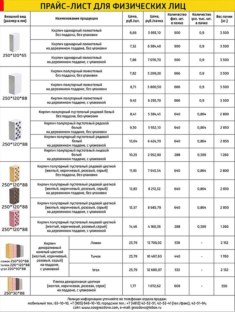 Известно, что масса одного куба одинарного керамического полнотелого кирпича равна 1800 кг, а пустотелого – 1250 кг. Для силикатной вариации эти величины будут равны 1900 и 1640 килограммам соответственно. Зная, что в 1м3 материала насчитывается 513 единиц, можно рассчитать, что в стандартный 20-тонный длинномер удастся загрузить не более 11 кубов (5640 шт.) полнотелого и 16 кубометров (8200 шт.) пустотелого керамического, либо 10,5 полнотелого (5380 шт.) и 12,2 пустотелого (6250 шт.) силикатного кирпича.