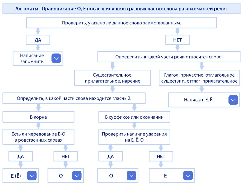 Подробная схема для выбора гласных О, Е, Ё в разных частях речи: