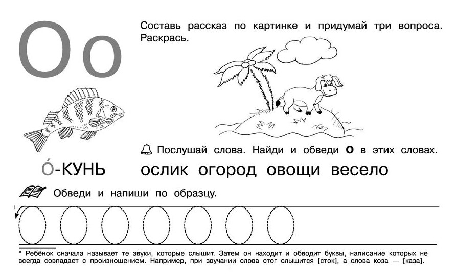 На первой странице дается графическое изображение буквы О, которая окрашена в красный цвет, для обозначения гласного звука. Дети выделяют первые звуки в словах «осы, ослик». Внизу графическая схема слов с количеством букв, слогов, ударения (звуко-буквенный анализ).