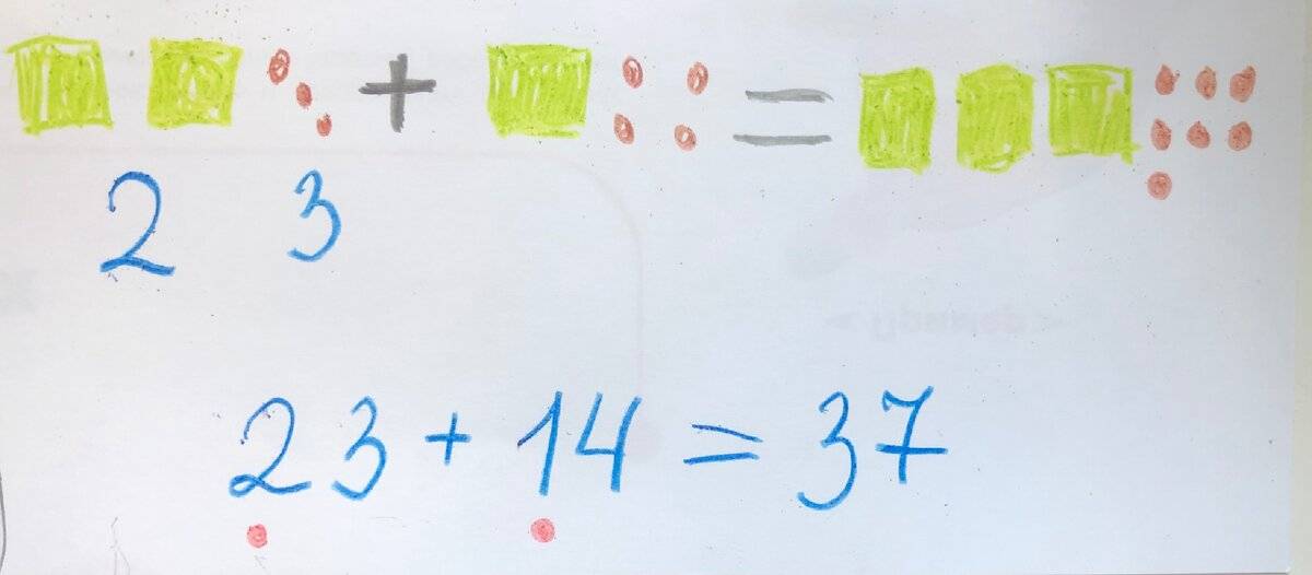 “Давай теперь количество коробок, которое складываем, запишем числом – вот, прямо здесь, под коробками. И запишем количество отдельных штучек, прямо под точечками”: