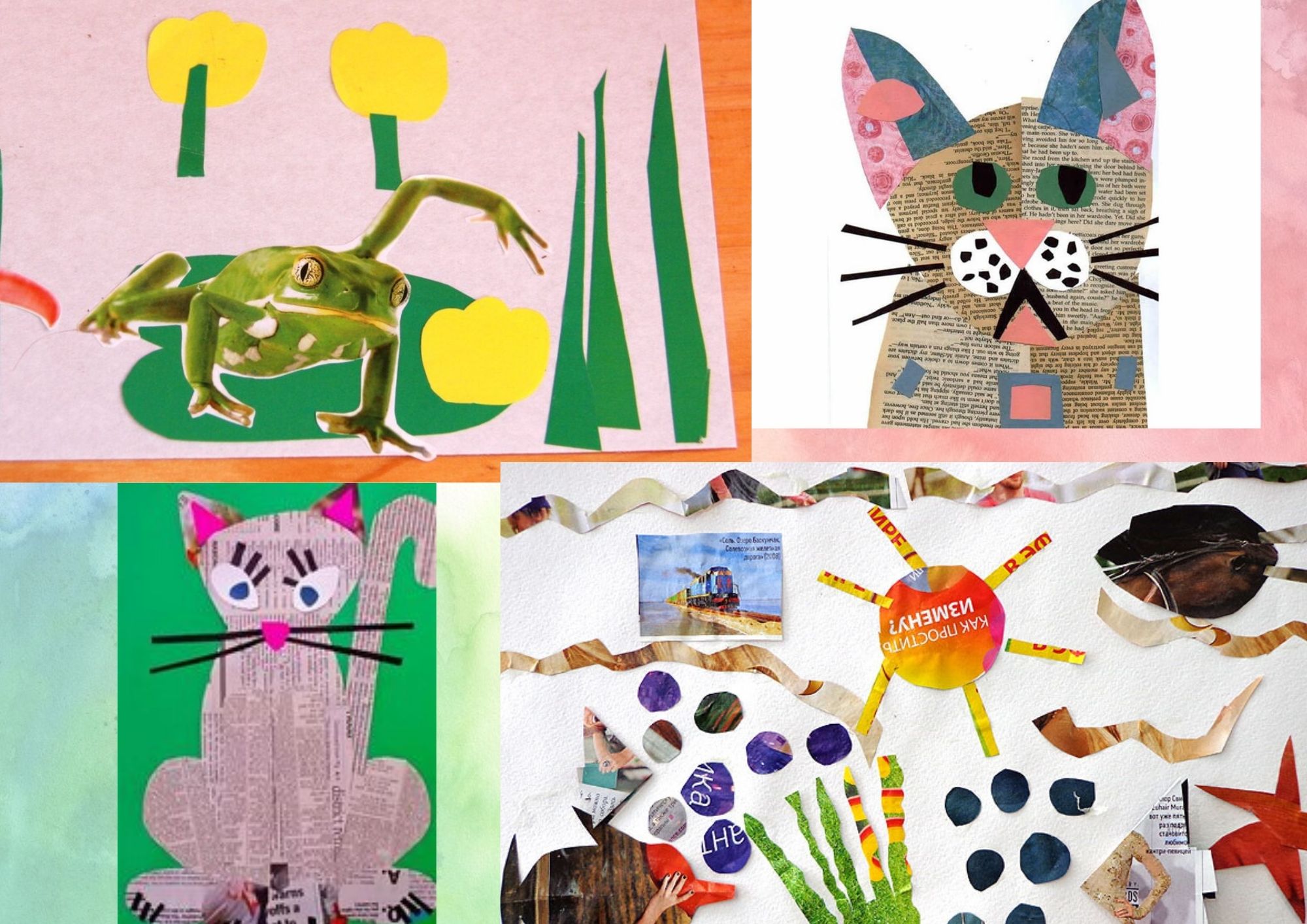 Как вариант, можно просто вырезать картинки из журналов и создавать их них композиции. Интересные примеры тут: