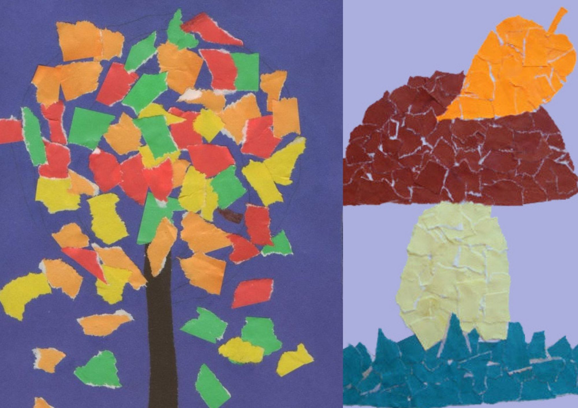 - Из рваной бумаги. Очень простой вариант, который подойдет даже для самых маленьких художников. Порванную на небольшие клаптики бумагу, необходимо наклеить на основу в хаотичном или определенном порядке для создания композиции.