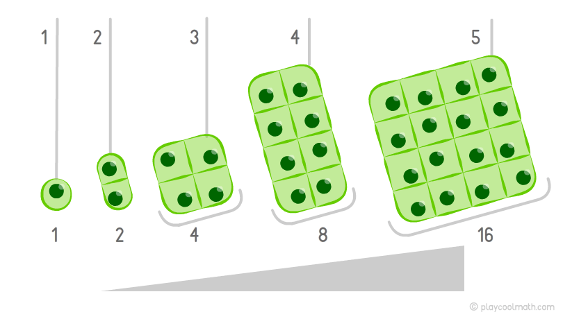 Приведем пример возрастающей закономерности, которая сложнее чем в примере с деревом. Представьте одноклеточный организм, который каждую минуту делится на две клетки. На картинке хорошо видно, что в первую минуту мы видим 1 клетку, во вторую — уже 2 клетки, а затем 4 клетки, 8, 16. Каждую минуту количество увеличивается в 2 раза. Зная предыдущее количество, можно узнать, сколько будет клеток в следующую минуту. Этот процесс называется тоже возрастающей закономерностью. Для настоящих математиков будет несложно установить формулу увеличения закономерности для этого примера. Эта задача для тебя еще сложная, так как ты только начали изучать математику. Главное сейчас чтобы ты понять, что такое закономерность.