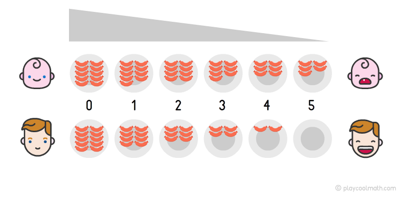 Этот процесс называется убывающей закономерностью. Второй участник съел всю тарелку сосисок за пять минут и победил!