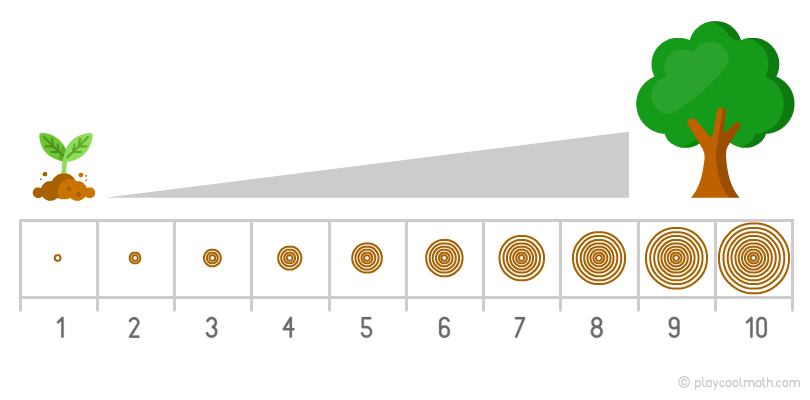 Например, дерево растет и на его стволе каждый год добавляется одно новое кольцо. Этот процесс называется простой возрастающей закономерностью. В этой закономерности легко вычислить, сколько колец будет через 2 года или через 10 лет. Количество колец в стволе соответствует возрасту дерева.