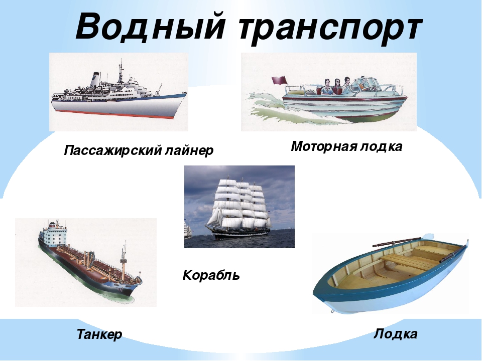 В классическом понятии водный транспорт это корабль, катер, яхта. Но к категории судов также относят байдарки, надувные лодки, баржи, катамараны, судно на воздушной подушке, а так же буровые устрановки, экранопланы, экранолеты, гидросамолеты.
