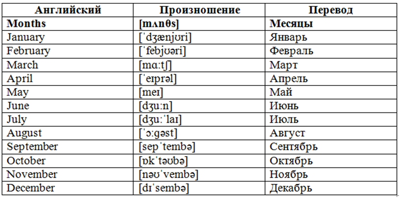Таблица месяцев в английском языке с транскрипцией и произношением