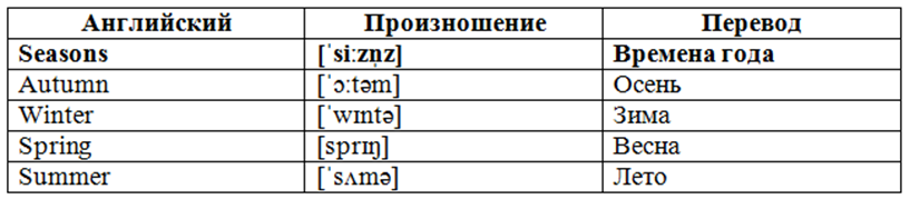| Время года на английском | Транскрипция и транслитерация | Русский перевод | Месяцы по сезонам (US, UK) | Месяцы по сезонам (UK) |