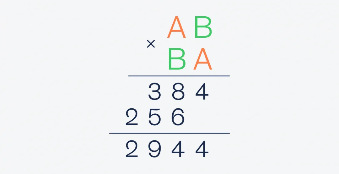 Число 256 получилось из умножения AB × B, то есть двузначного числа на однозначное. Из всех наших пар 128 × 2 не подходит, потому что 128 — трёхзначное число. И 16 × 16 тоже не подходит, потому что в этом случае мы умножаем не на однозначное, а на двузначное число.